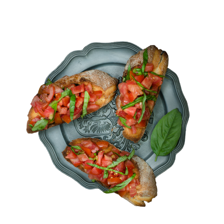 Knuspriges Brot mit frischen Tomaten, Olivenöl, Mozzarella und einem Hauch Knoblauch, perfekt als Vorspeise.
